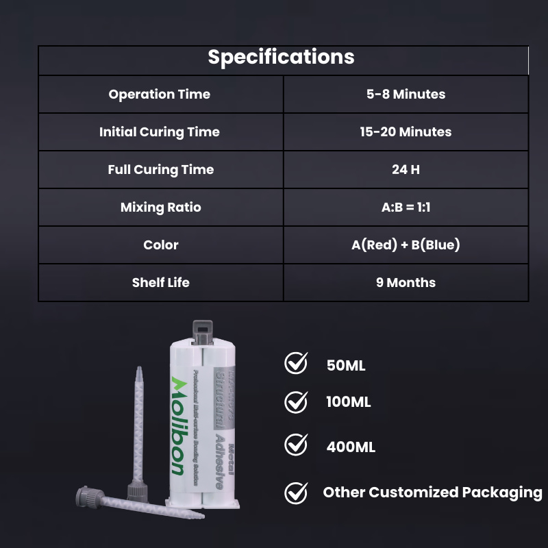 고강도 산업용 접착에는 이 제품을 선택하십시오. 금속 접착제 아크릴 접착제그것은 양쪽을 안전하게 연결합니다. 궤조(강철,알류미늄, 구리) 그리고 엔지니어링 플라스틱(ABS,PC), 별도의 프라이머가 필요하지 않습니다.